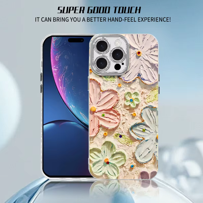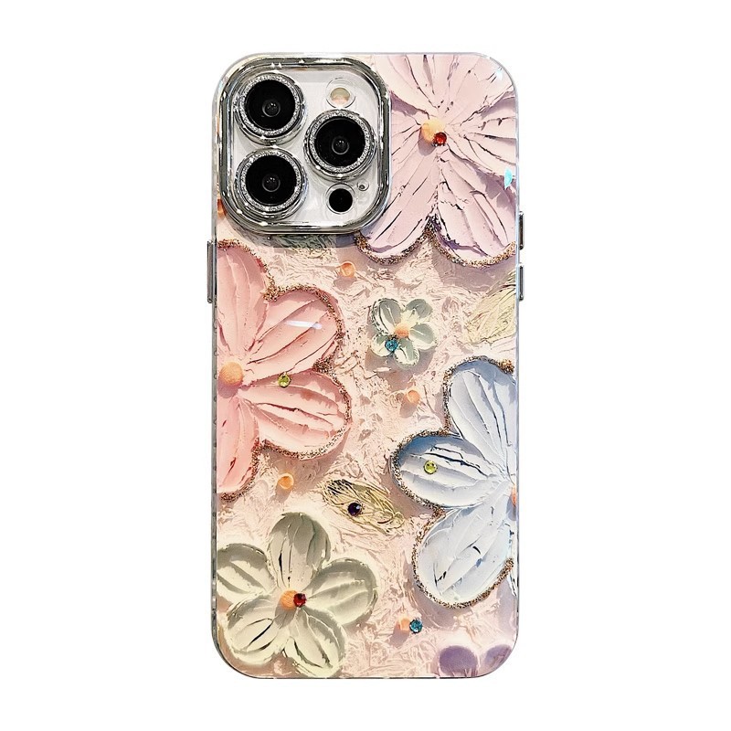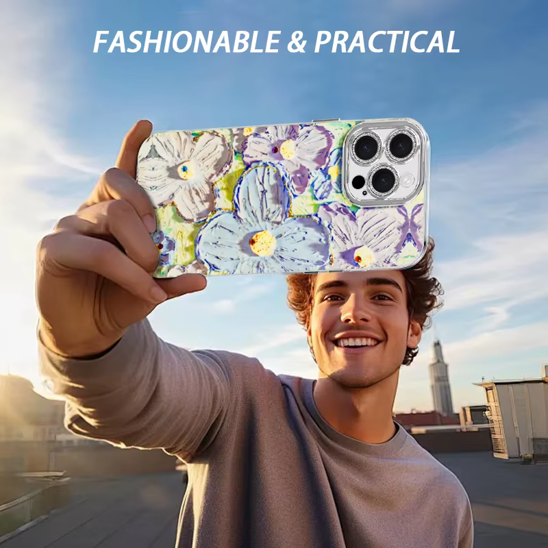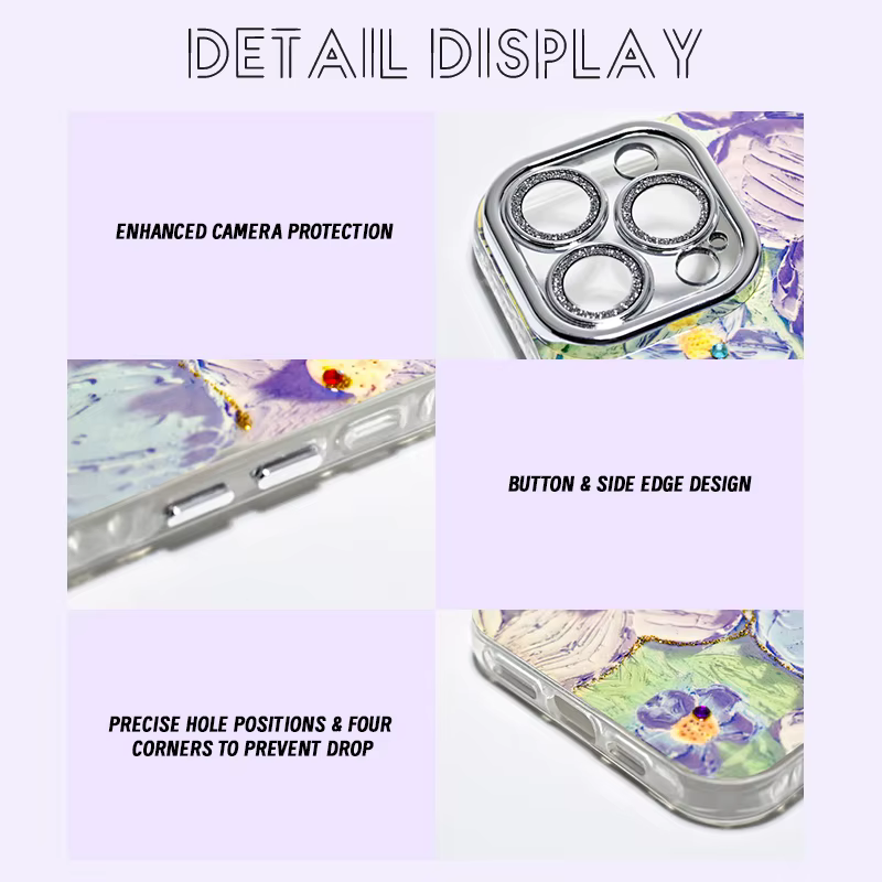 Floral oil-painting TPU case with glossy glitter shine and shockproof protection for iPhone models—stylish, durable, and eye-catching.