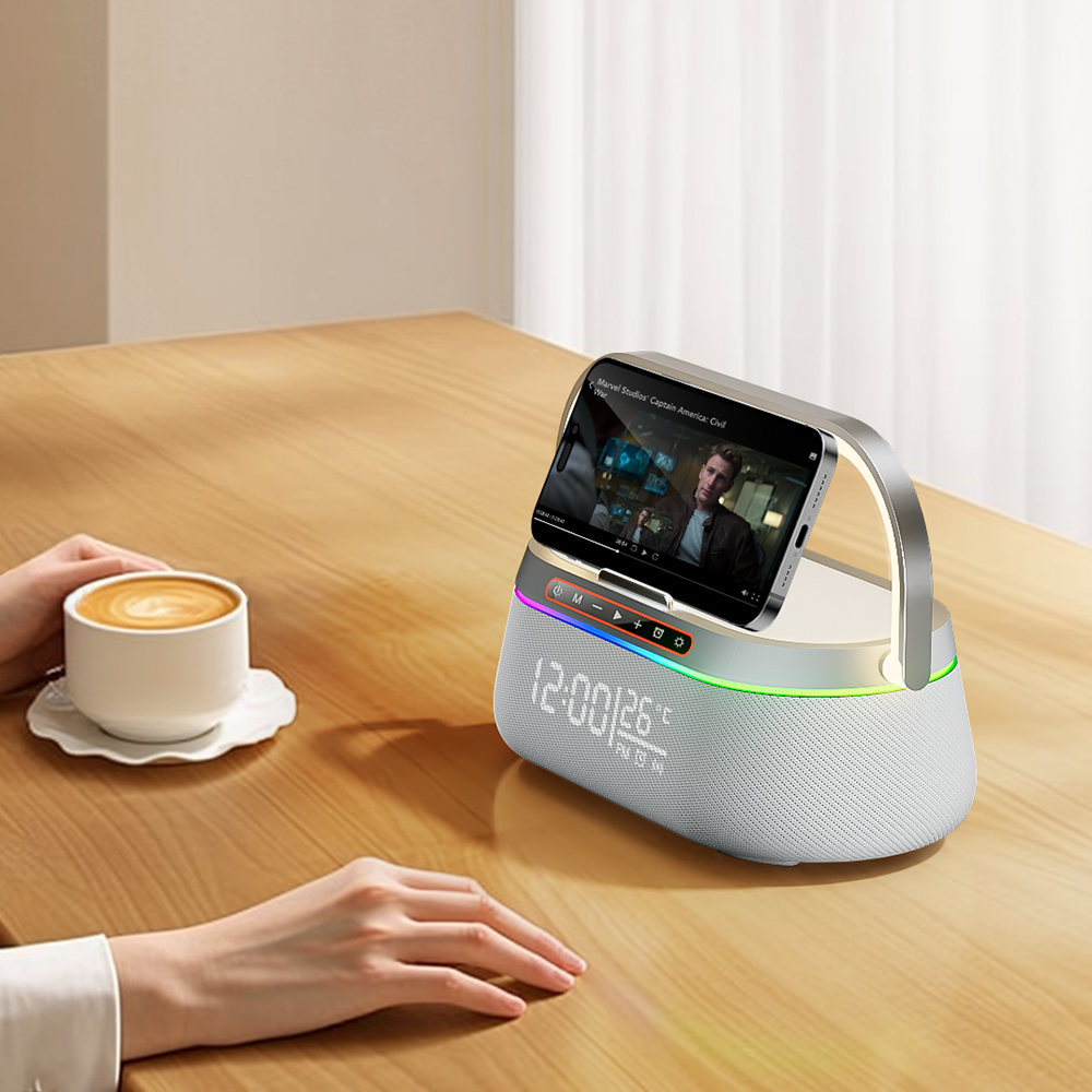 DetailBrand NameSIGORfeatureMobile phone + speaker + clock + night light + atmosphere lightSpeaker versionV5.4 + BR + EDR + BLESpeaker frequency30HZ--18khzBuilt-in battery1800mhInput voltage5V/3A 9V/3A 12V2AOutput power5W.7.5W.10W.15WWire length1m3AProduct interfaceTYPE-CColorgray, white