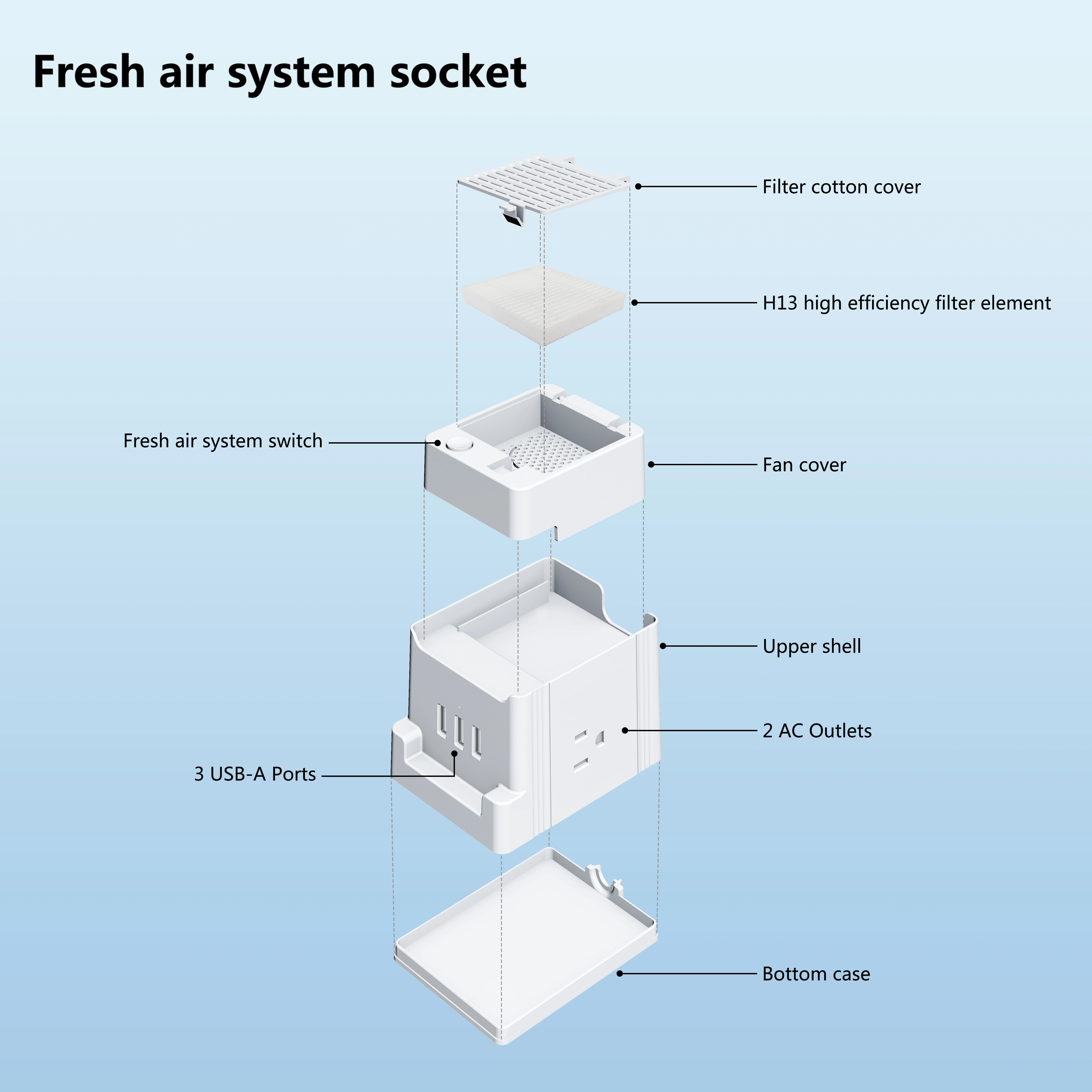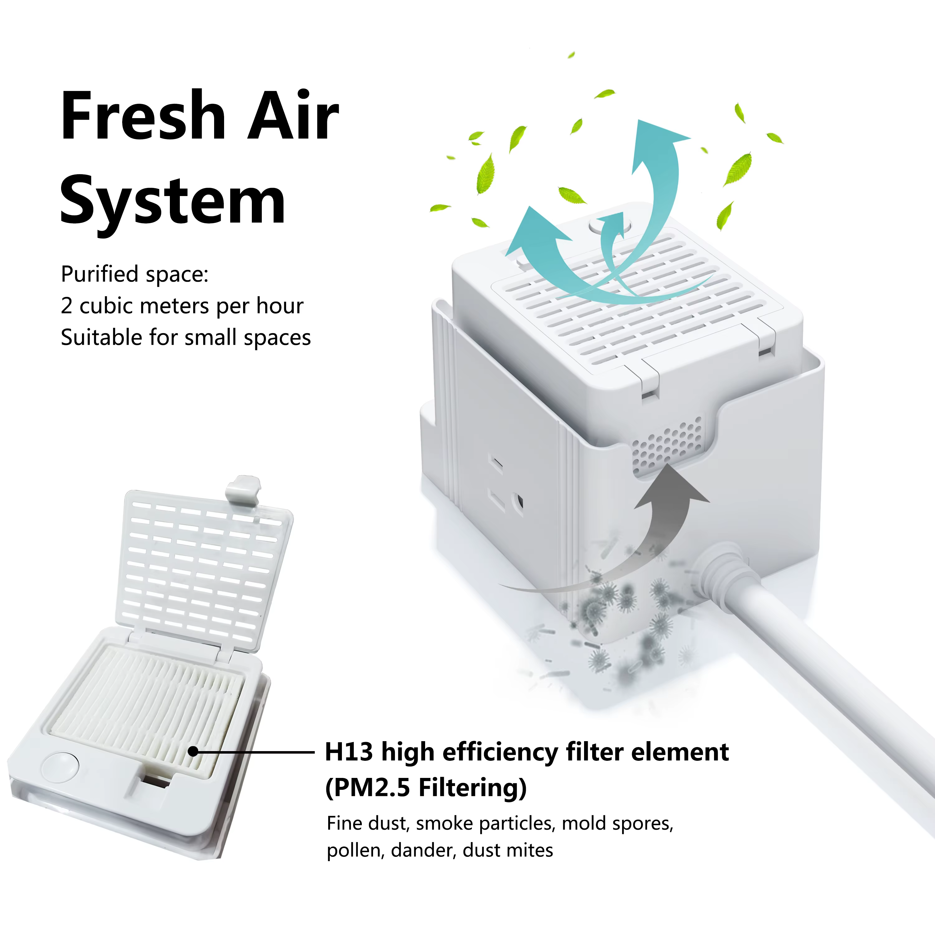 DetailBrand NameSIGORAC outlet and USB port2 US Outlets And 3 USB PortUSB Output5V 4.8A/3USB Ports, 2.4A Max Per PortUSB-C outputPD 20W (when other USB ports non-occupancy)USB-A1 outputQC 18W (when other USB ports non-occupancy)Cable Specifications14AWG(ETL certified)Cable length1.5MMaterialPCFeatureFeatureColorWhiteFeatures of the product* Fresh air system socket,great for home and desk..While charging electronic products,it can also purify the surrounding air,fase sneezing,congestion,and other allergy symptoms caused by airborne contaminants. * Fast outlet USB charging station.* 2AC Outlets+3 USB Ports.For charging phones,tables,and other USB-powered electronics.* Fresh air system uses H13 HEPA filter,which can effectively filter any particles larger than 0.3 micronst,can do 99.97%