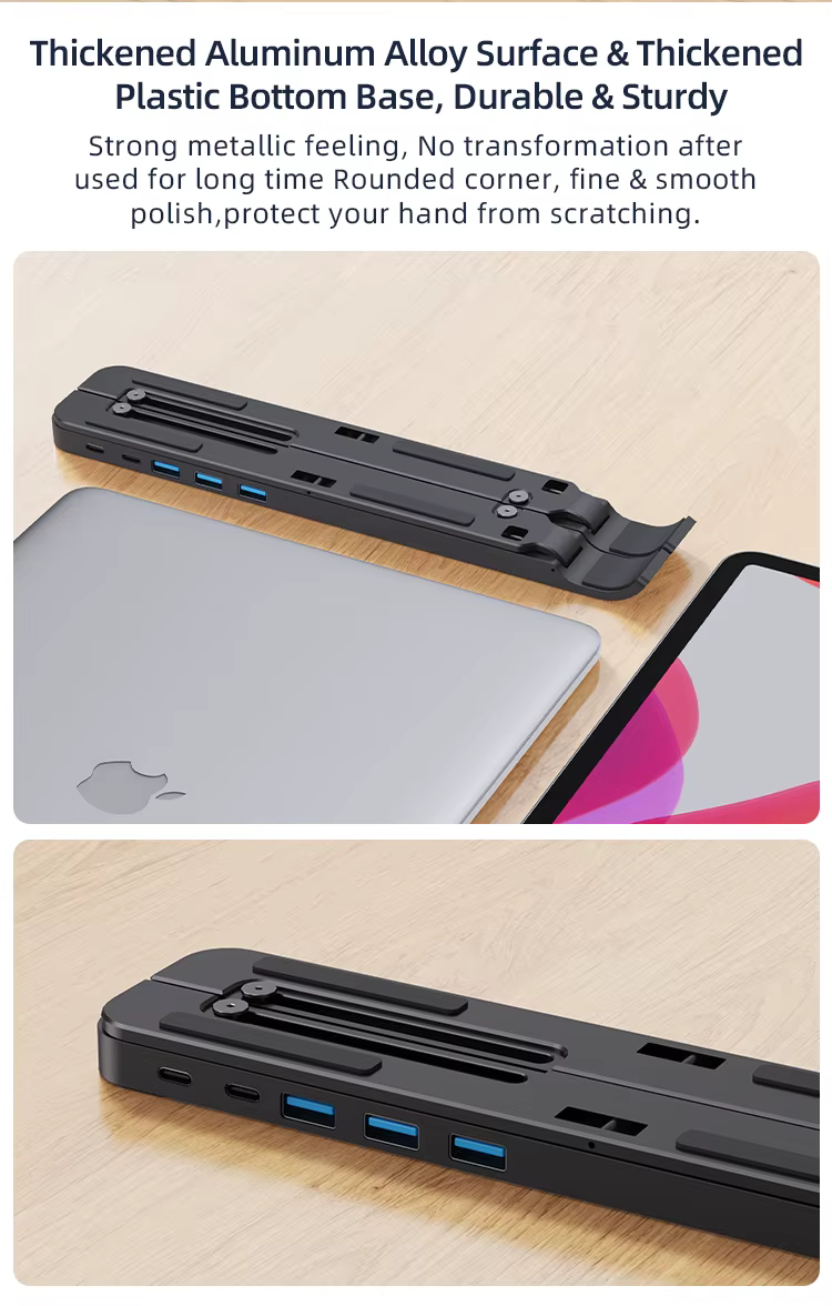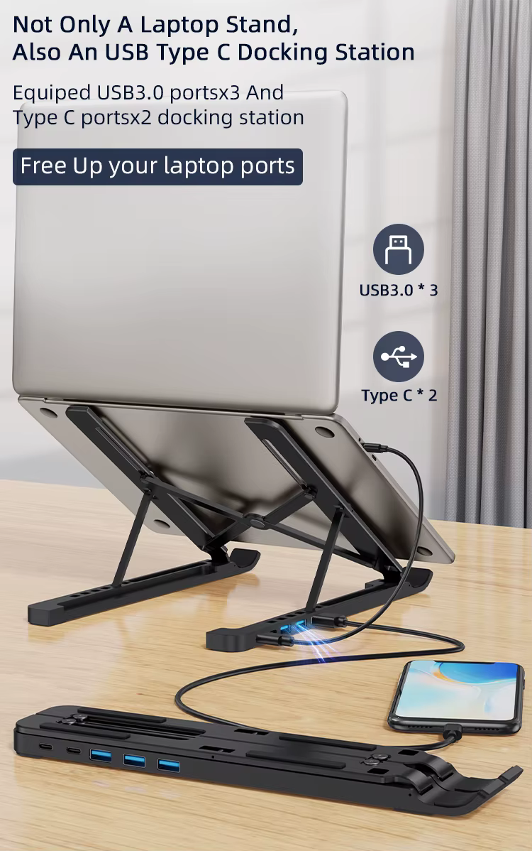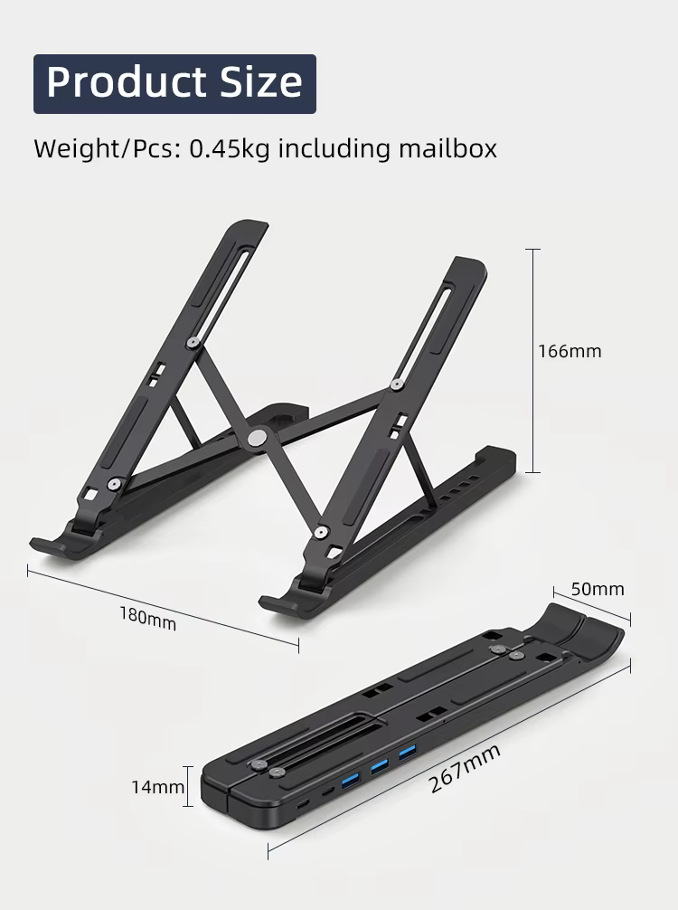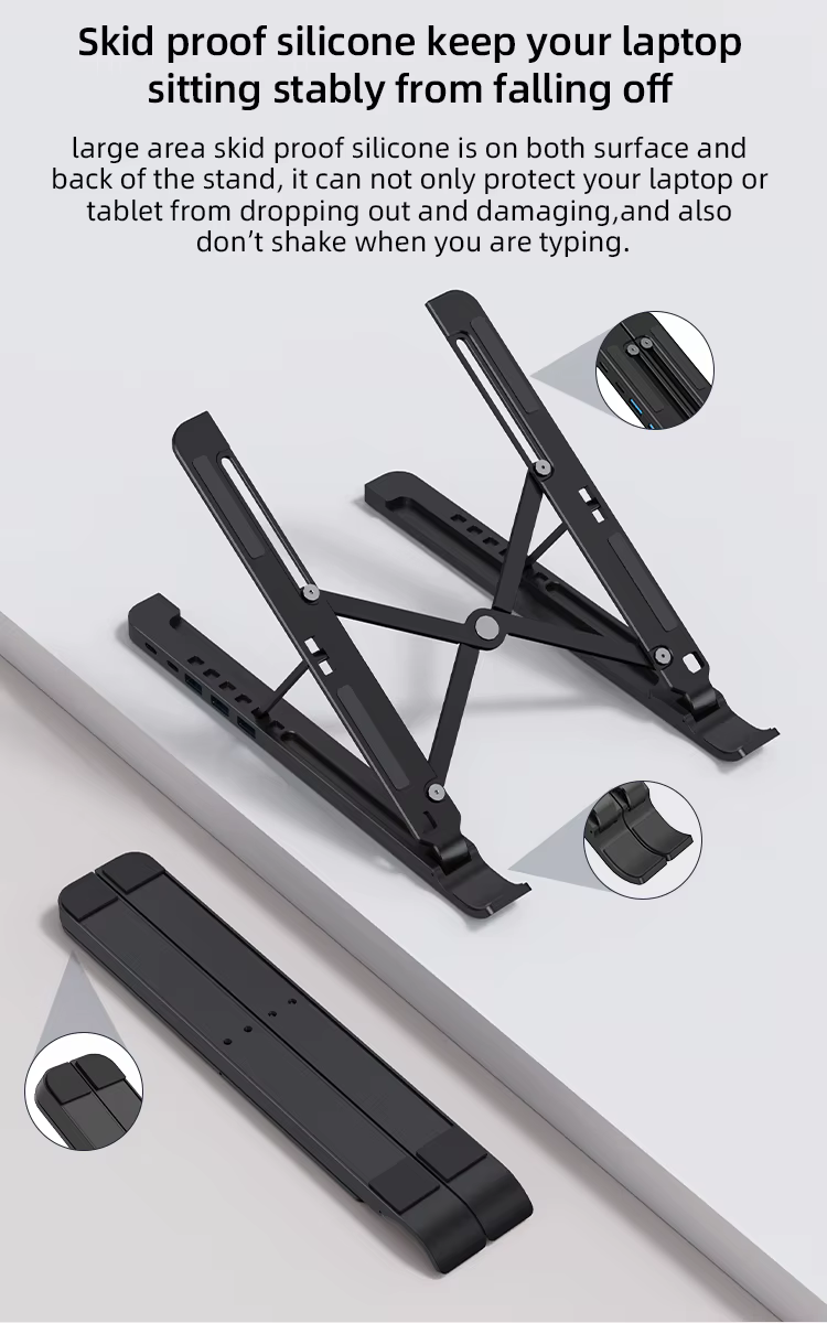 DetailBrand nameSIGORMaterialAluminum+ABS+SiliconeSuit for80-166mm LaptopInterfaceUSB3.0*3+Type C*2 Dock stationSupported SystemLaptopNumber of interface5TypeCooledFeature 1Strong Magnetic For FoldableFeature 2Foldable for easy storageProduct size180*166mm (Max)