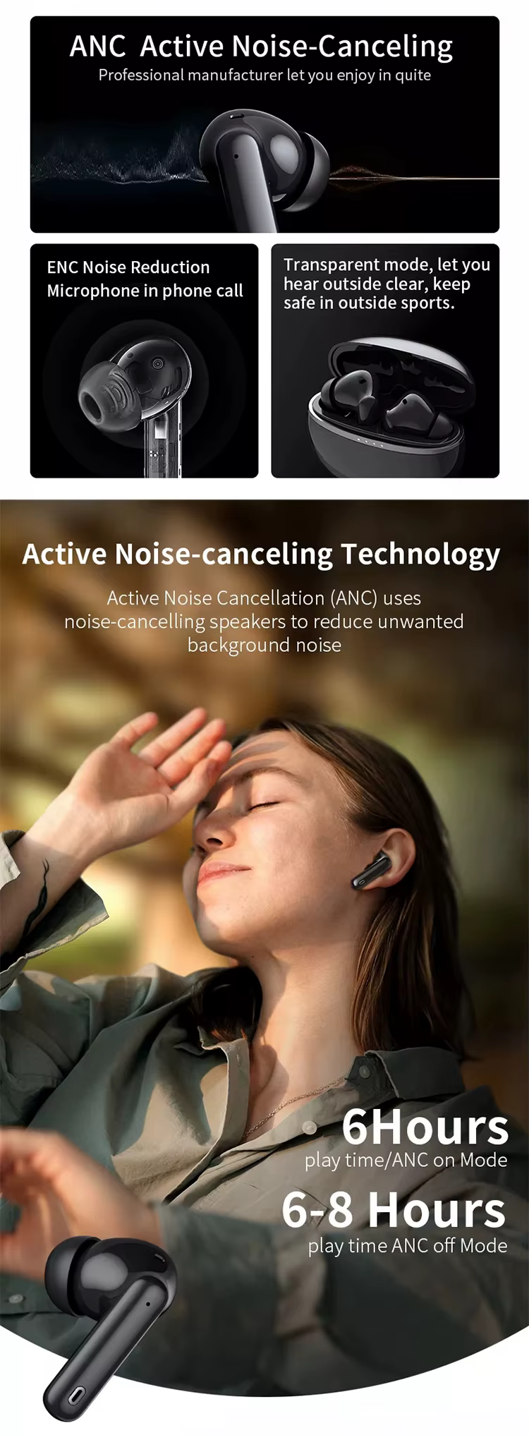 DetailBrand NameSIGORnoise cancellingActive Noise Cancellation (ANC), Environmental Noise Cancellation (ENC)bluetooth standard5.3waterproof standardIPX-4Estimated Battery Life5-10 hoursConnectionWirelessBattery Charging Time1-3 hoursmaterialABSMP3 Playing Time5-7hoursCharging box size62*49*26 mm