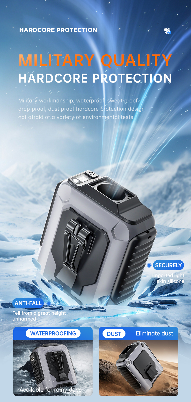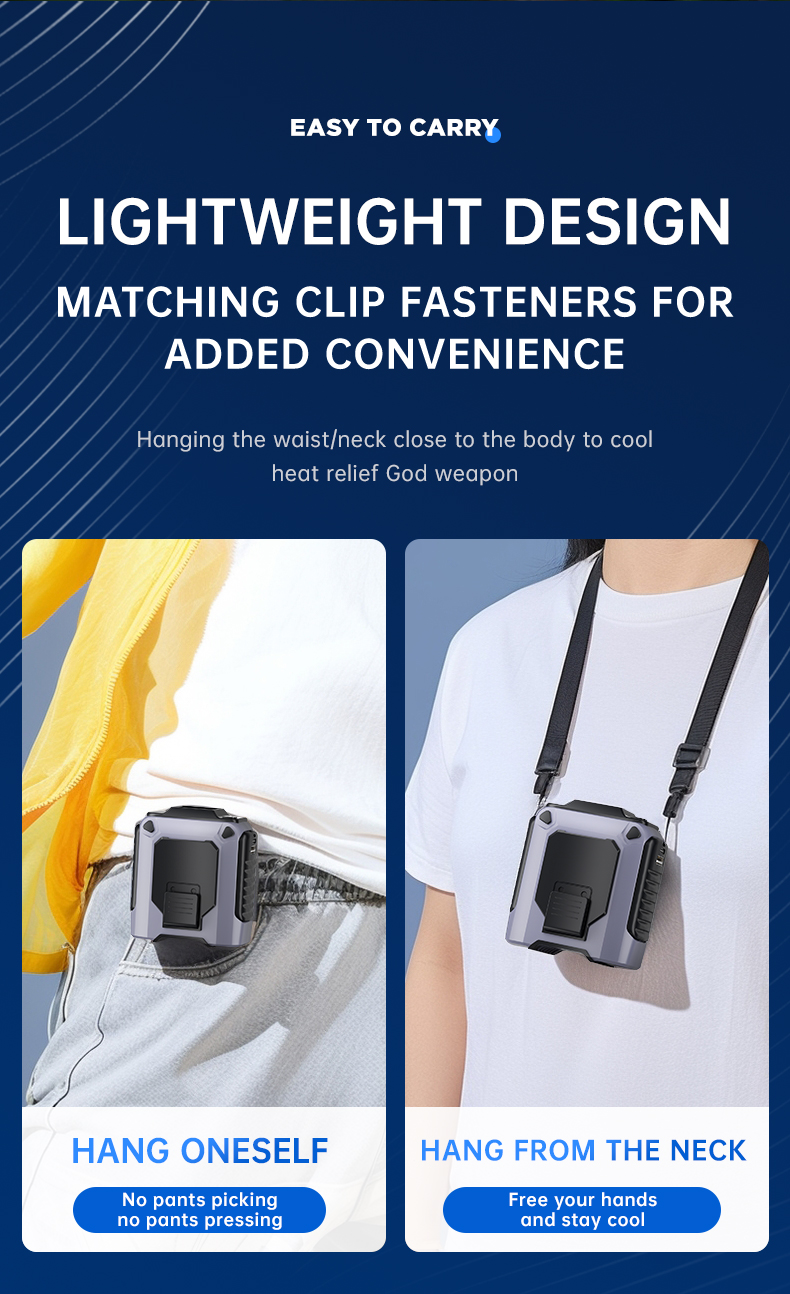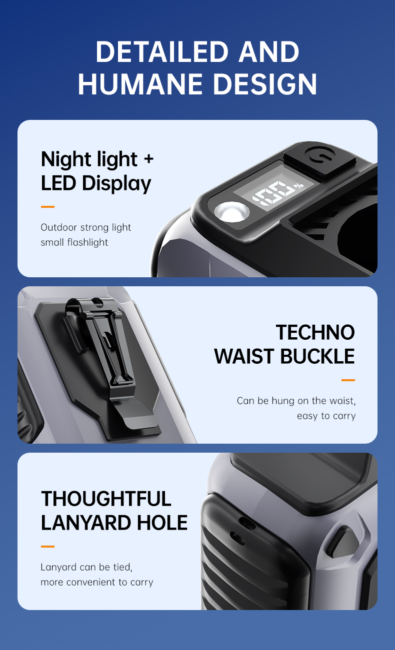 DetailBrand NameSIGORProduct namemini portable waist fanColorwhite, black, orangeStyleModernMaterialABSCharing time3 hoursworking time3-10 hoursBattery4000MAHSpeed100 gearFeatured FunctionHigh speed ,power bank, torch
