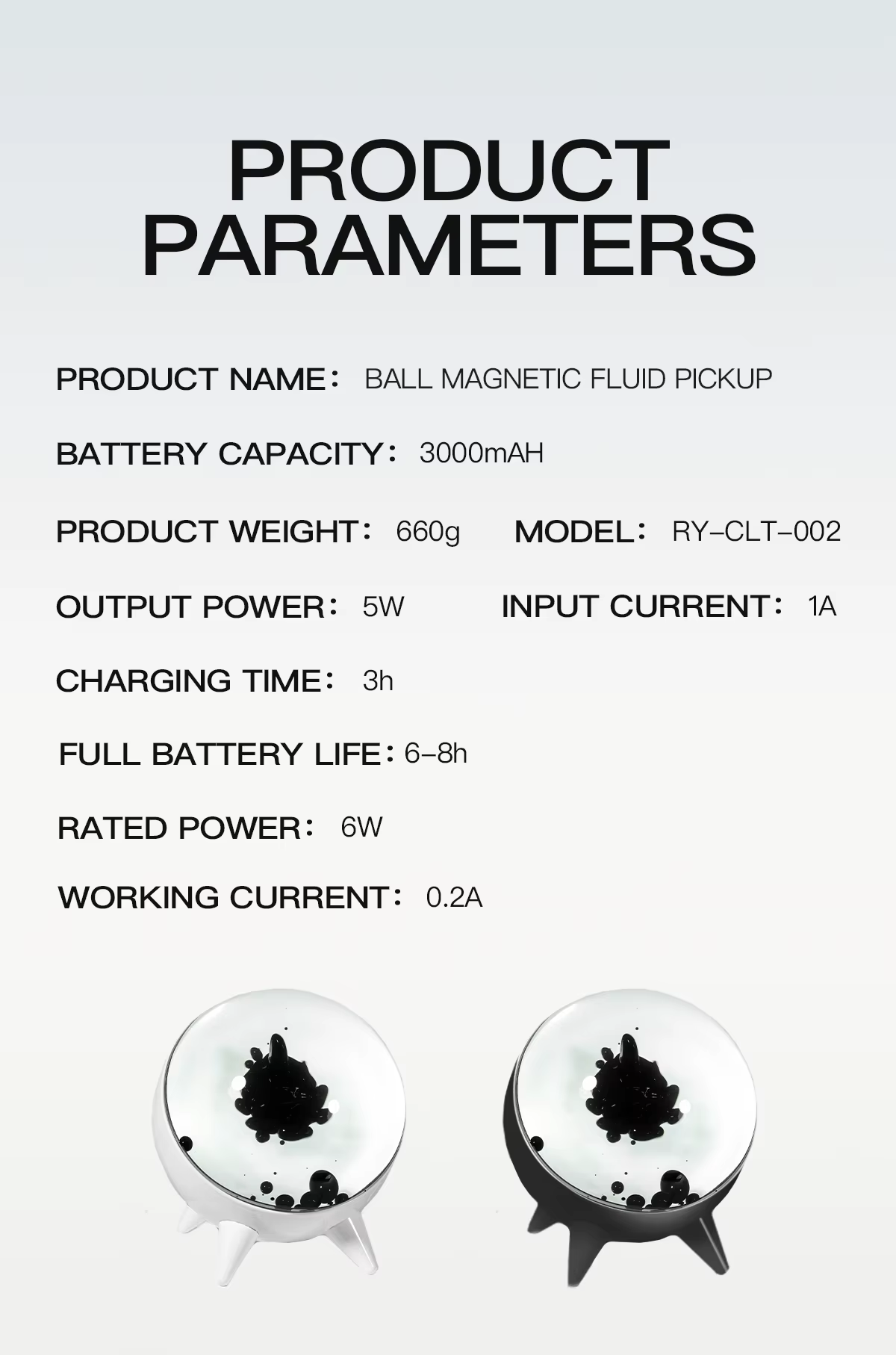 DetailBrand NameSIGORproduct nameball magnetic fluid pickupbattery capacity3000mahproduct weight660goutput power5winput current1acharging3hfull battery life6-8hrated power6wworking current0.2A