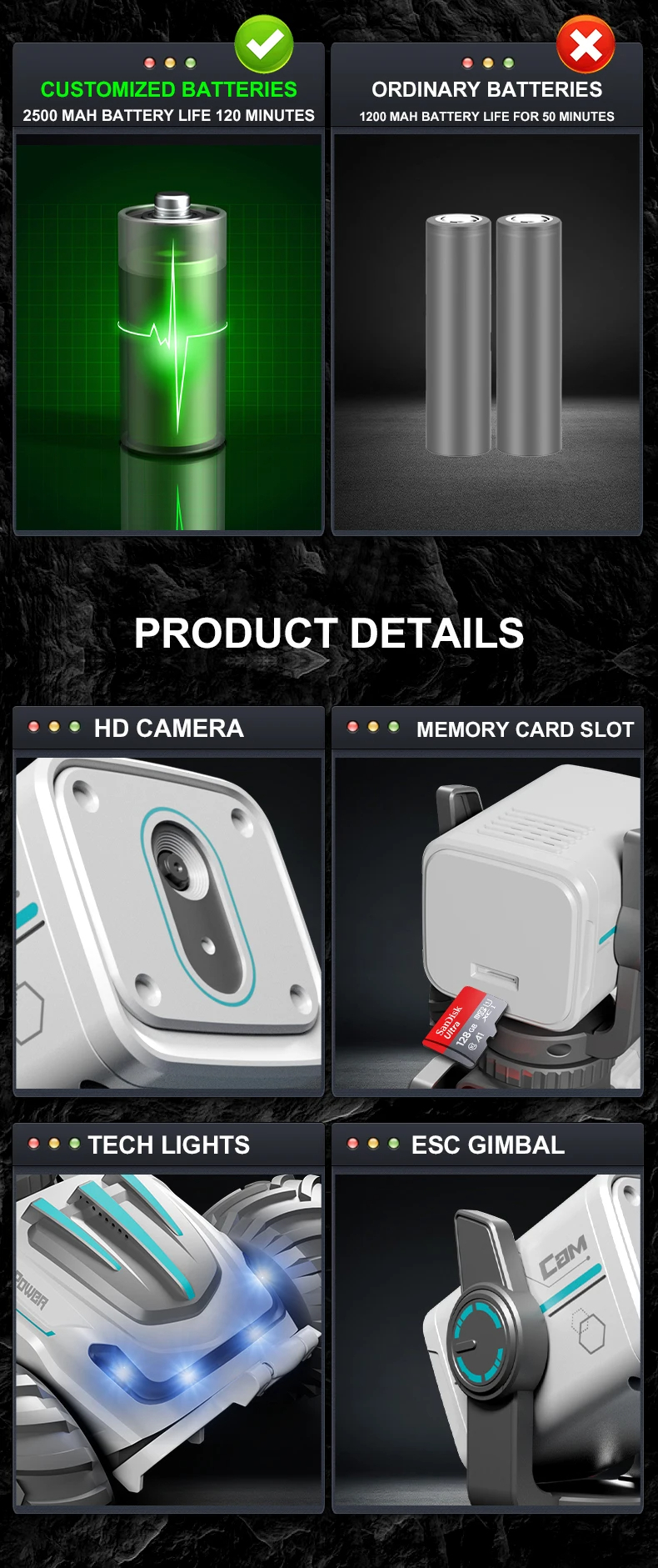 DetailBrand NameSIGORMaterialMetal, PlasticRemote distance60MVideo resolution720pScale1:12Packaging listOriginal Box,Batteries,Operating Instructions,Remote Controller,Camera,USB CABLEMemory Card4G/8GWorking time30mins/60minsBatterySingle battery/dual batteryProduct size175*270*190MM