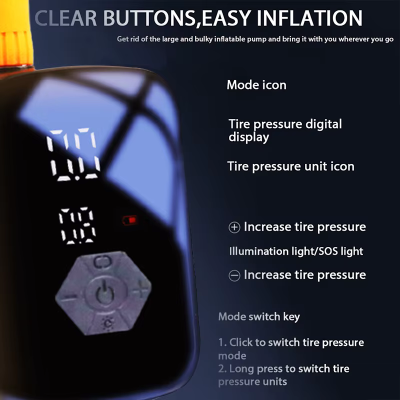DetailBrand NameSIGORFunctionEmergency Light, Power Indicator, Tire Pressure Monitor, Car Air Pump, Car Tire Inflator, Car Air CompressorNoise Level<85dbFeaturePortable Car Tyre Air PumpBattery capacity2000mAh*2UsageTire Inflation SystemMaterialABS+MetalVoltage7.4VMax Pressure101-150PsiPower60W