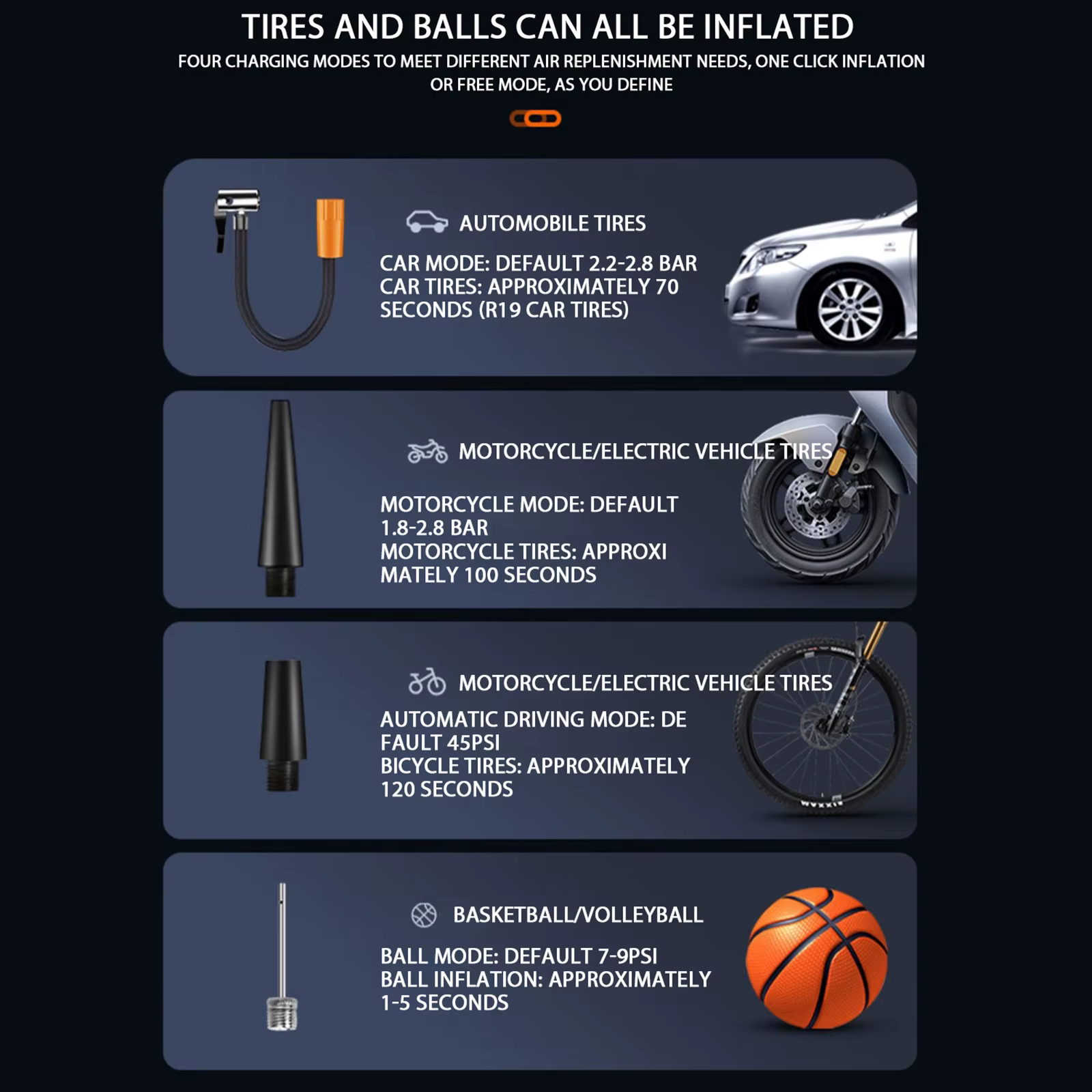 Compact Portable Air Compressor – Multi-Function Tire Inflator with Long-Lasting Battery, Emergency Light & Durable ABS+Metal Build.