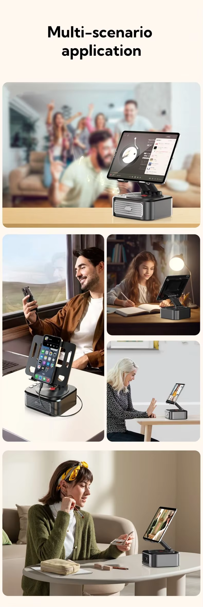 DetailBrand NameSIGORproduct nameTablet Stand with Bluetooth speaker with Power bankAdjustment angle360Battery capacity3000mAhPlayback time2-5 hoursOutput power5Wx1InputDC5V(Type-C)Charging time1 hourMaterialABSFunction3 in 1 Tablet stand with Bluetooth speaker and can charge the phone