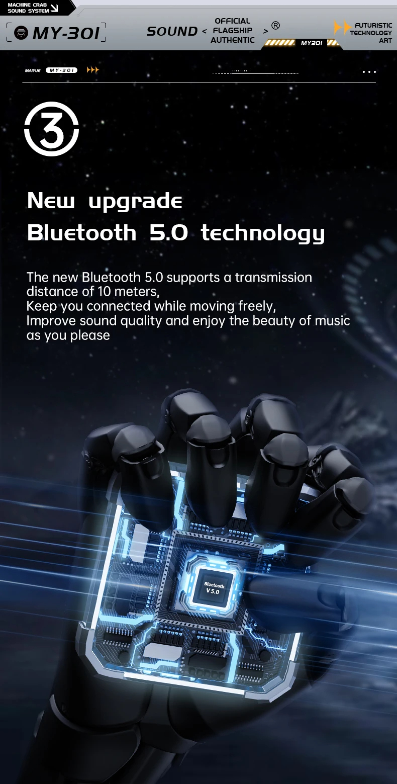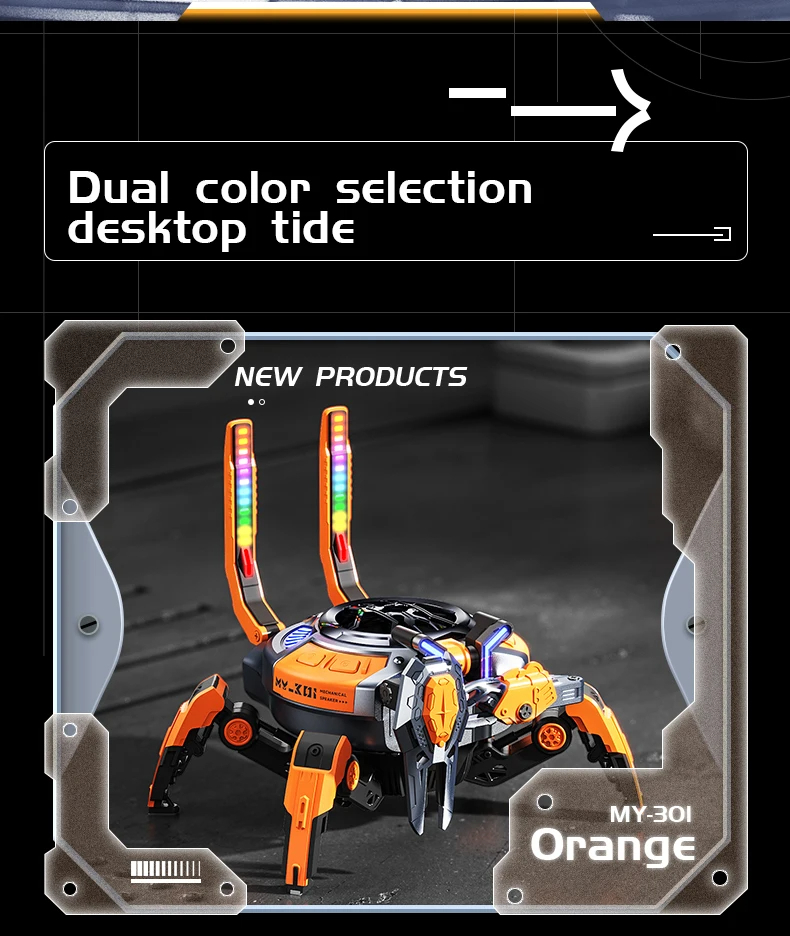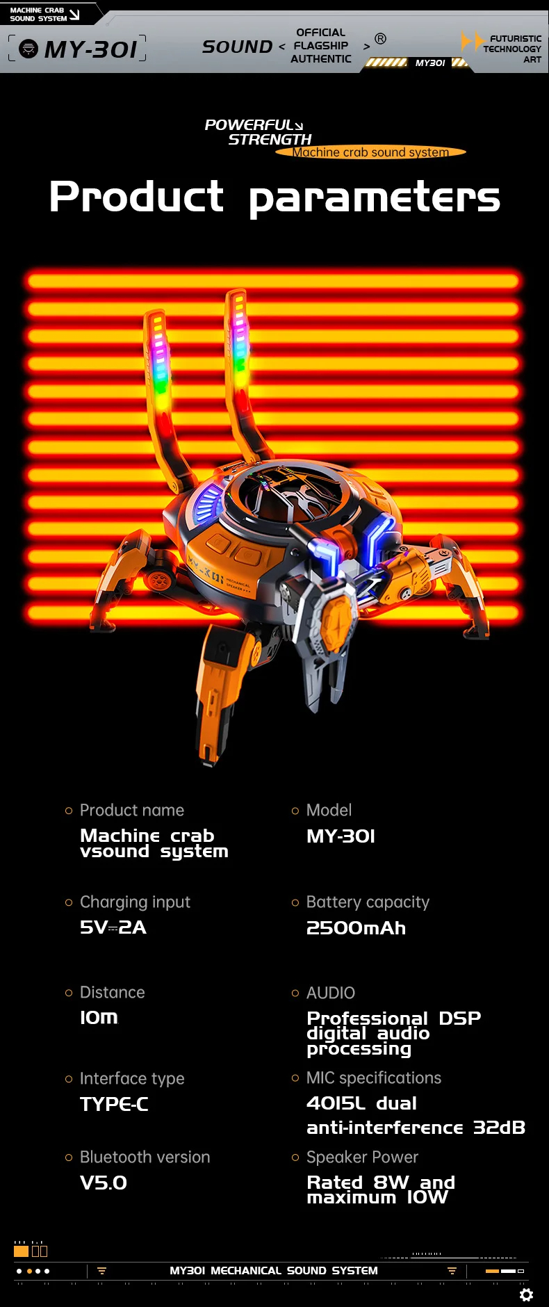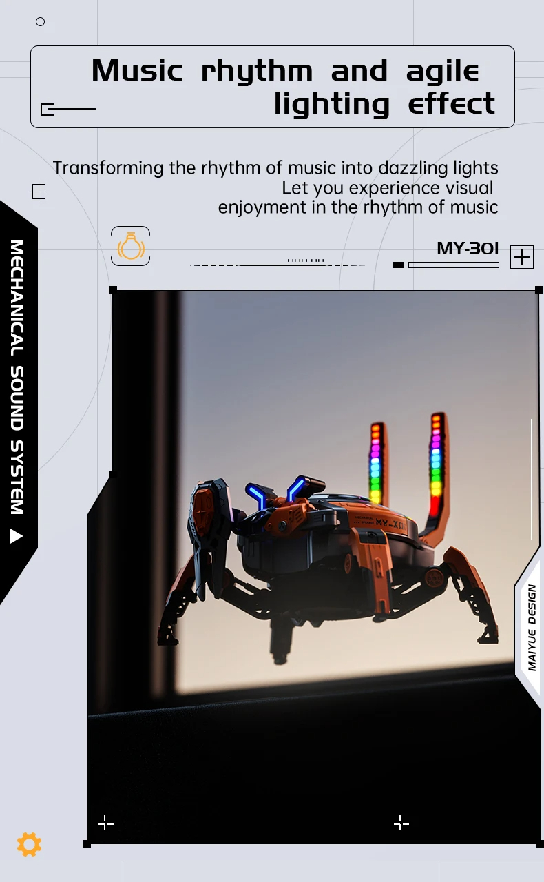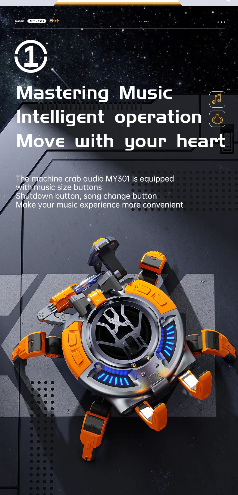 DetailBrand NameSIGORcharacteristiccolorful LED lightProduct NameWireless Mechanical Crab RGB Rhythm Light Audio SpeakerDesign styleModernMaterialABSappComputer/Laptop/Mobile Phone/MP3/MP4MaterialLED flashSpecial FeaturesMechanical crab shapecommunicationWirless SpeakerRated Power8W/10W