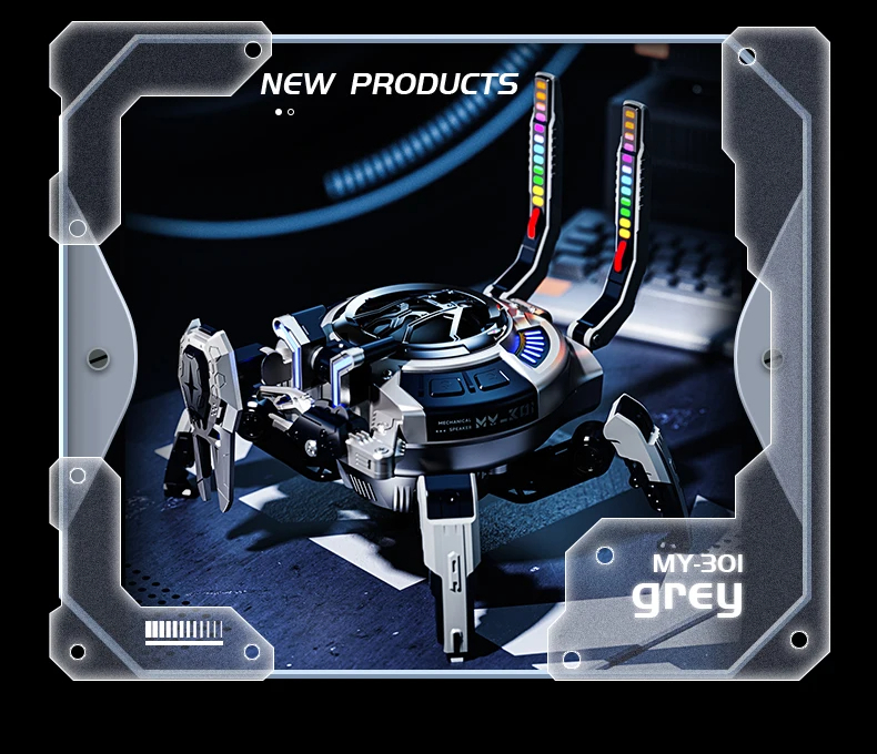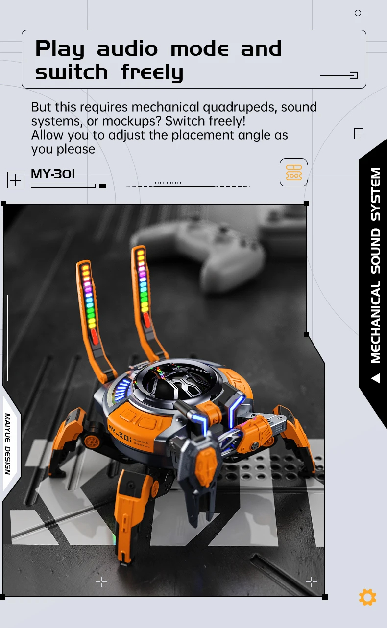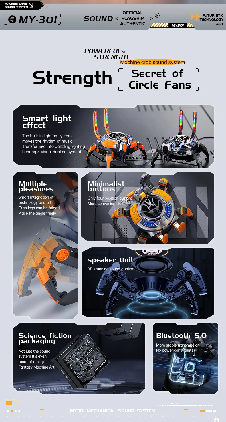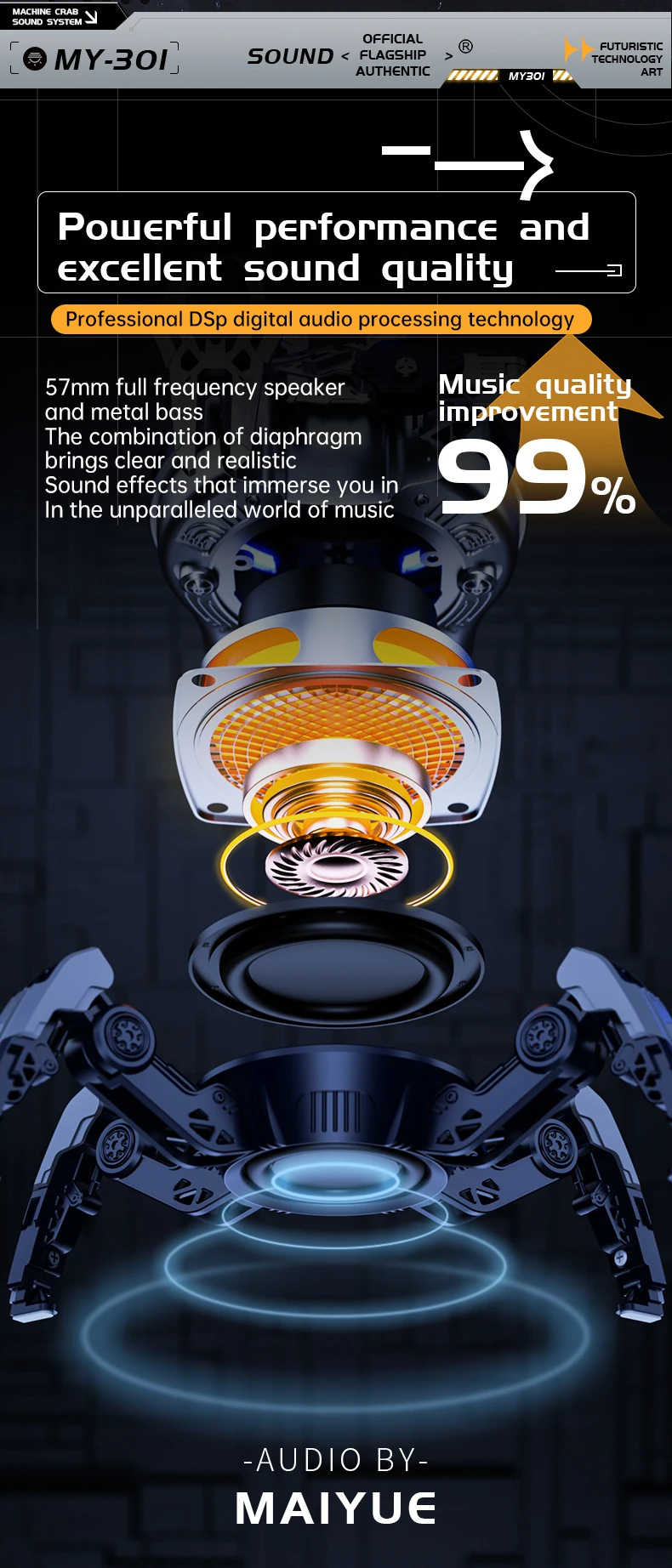 DetailBrand NameSIGORcharacteristiccolorful LED lightProduct NameWireless Mechanical Crab RGB Rhythm Light Audio SpeakerDesign styleModernMaterialABSappComputer/Laptop/Mobile Phone/MP3/MP4MaterialLED flashSpecial FeaturesMechanical crab shapecommunicationWirless SpeakerRated Power8W/10W